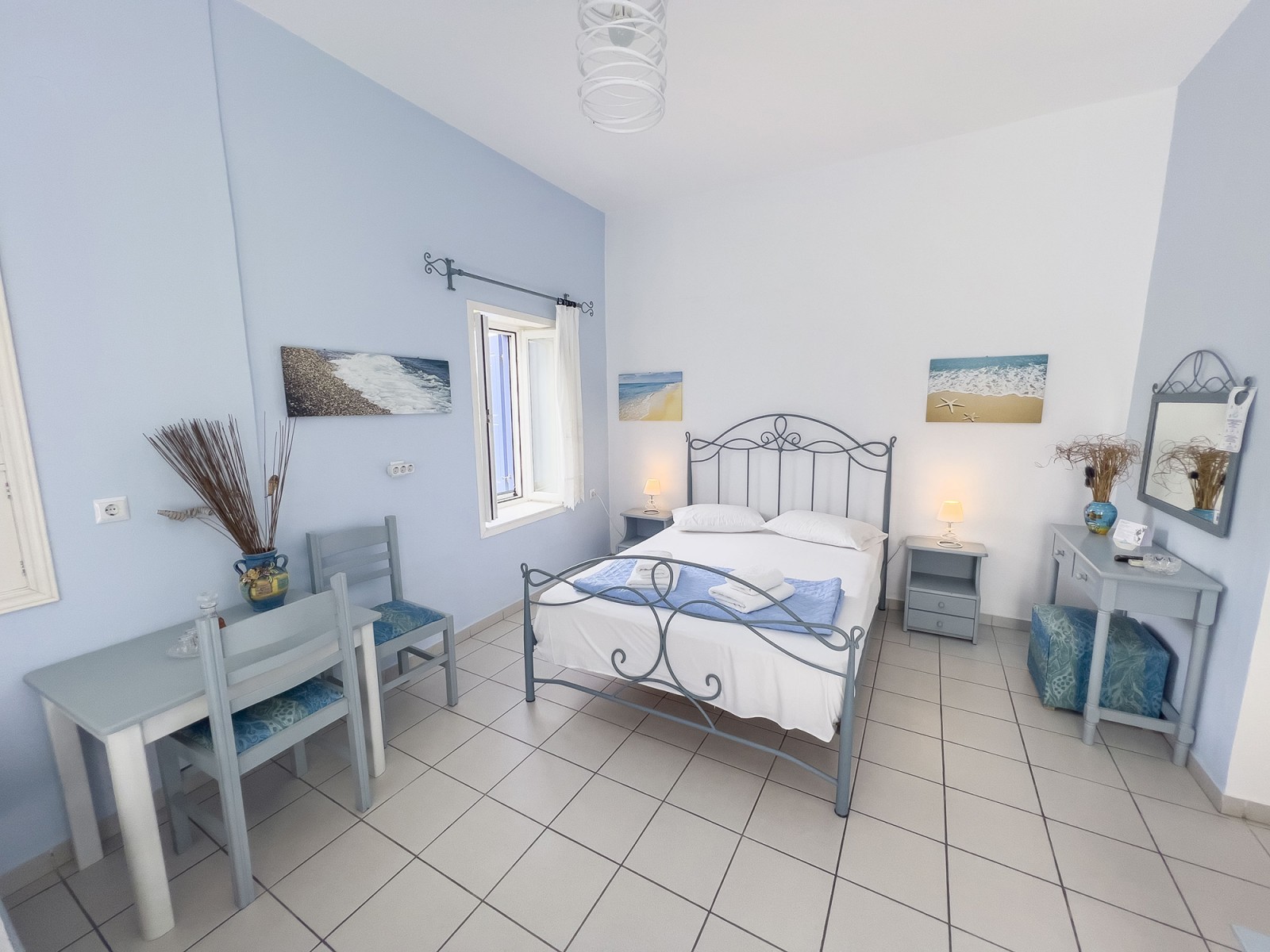 This Cycladic-style room features a fully equipped kitchenette with a dining area, air conditioning, a TV and a private balcony with garden views. The private bathroom includes a hairdryer.